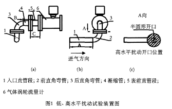 高水平擾動試驗裝置與低水平擾動試驗裝置總體管路結構相同,不同的是,高水平擾動試驗裝置在低水平擾動試驗裝置結構中的兩個直角彎管之間加了半圓形開口結構的墊片,即使該處的流通麵積為該處管路橫截麵積的一半,開口位於(沿氣體流動方向)*1個彎管的外側半徑處,如圖l(b)、(c)所示。