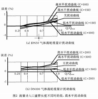(2)隨著流量計表前直管段的加長,流量計高、低水平擾動的曲線基本上是逐漸接近無擾動的曲線;