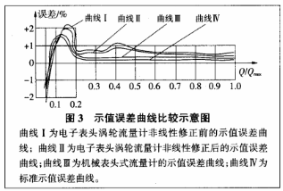 從專業技術角度來說,電子表頭式渦輪流量計一般由於無法有效降低儀表內部阻力,不經修正的示值誤差曲線多處(多段)超差,隻有通過將儀表流量分為幾段采用不同的儀表係數進行非線性修正,才能使它達到合格示值誤差曲線的要求。機械表頭式渦輪流量計的示值誤差曲線完全由儀表的結構設計技術水平、零部件製造水平、裝配工藝水平、整機測試水平來決定,不存在非線性修正的問題。示值誤差曲線比較如圖3所示。
