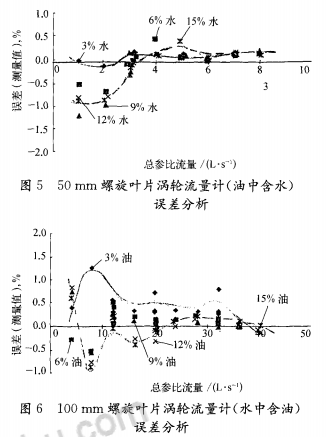 3)油中含水與水中含油兩者誤差變化的差異。渦輪流量計測量水中含油*二組分體積分數變化引起測量誤差變化比油中含水大。