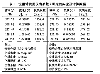 數據說明:為了更直觀地探討流量計在合理選擇誤差評定的方法以及由此涉及儀表計量特性等具體因素的影響,故在表1和表2中均分別以航空RP-3號噴氣燃油(低黏度)、航空10號液壓油(中黏度)為檢定介質在相同的量程下檢定分別出2組數據;表1中誤差評定的計算公式來自JJG1037-2008《渦輪流量計檢定規程》(以下簡稱規程)中(1)~(4),得出示值誤差(線性度);表2中誤差評定的計算來自*小二乘法運算公式算出值進行數據擬合求出理論值,*後得出儀表的引用誤差。此計算公式來自為《規程》以外的誤差評定方法。