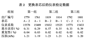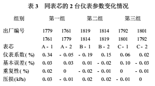 將每組儀表的2台表芯對換,重新進行檢定,獲取檢定數據,列於表2。將同表芯的2台儀表參數進行比較,獲得比對結果,列於表3。其中儀表係數以相對(百分數)表示。