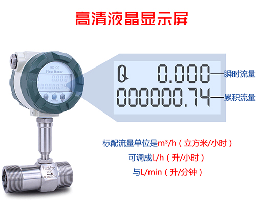 采用先進的超低功耗單片微機技術研製的渦輪流量傳感器與顯示積算一體化的新型智能儀表,采用雙排液晶現場顯示,具有機構緊湊、讀數直觀清晰、可靠性高、不受外界電源幹擾、抗雷擊、成本低等明顯優點。儀表具備儀表係數三點修正,智能補償儀表係數非線性,並可進行現場修正。高清晰液晶顯示器同時顯示瞬時流量(4 位有效數字)及累積流量(8 位有效數字,帶清零功能)。所有有效數據掉電後保持10年不丟。該類渦輪流量計均為防爆產品,防爆等級為:ExdIIBT6。
