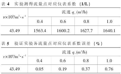 為證明該高粘度變流速自適應算法及公式的有效性,重新選取四個流量點:0.4m3/h、0.6m3/h、0.8m3/h、1.0m3/h對該公式以及算法進行精度驗證,得到表4數據,表5為各對應流量點的擬合後儀表係數的誤差。