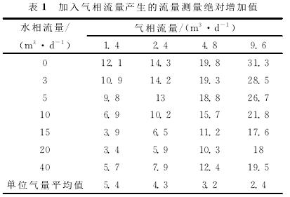 利用清水中渦輪的刻度方程計算加入不同氣體流量後渦輪響應頻率所對應的流量,即為加入氣體後的測量流量,再用所得測量流量減去配比的標準水流量,得到氣相加入後測量的絕對增加值,即加入氣相流量產生的測量誤差(見表1)。計算結果表明,加入氣體流量後,渦輪的測量流量明顯增加,尤其是液相流量較低時,增加的測量流量更高,氣體對流量測量產生了較大的測量誤差。低氣量下,平均1m3/d的氣量產生的測量誤差大約相當於5m3/d(絕對增加值)。