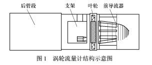 渦輪流量計結構示意圖如圖1所示,主要組件包括前導流器、葉輪、支架以及後管段。流體從機殼進口流入,*先經過前導流器,前導流器對流體流動有如下兩個重要作用: