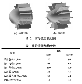 由於ρ和v為流體流動參數,不能隨意增減,因此隻能盡量減小壓損係數α,以達到降低壓損的目的。壓損係數除了受流體粘性、管徑及管長等因素影響外,與流量計內部各部件的幾何結構有密切關係。文獻通過試驗發現葉輪的形線、葉片數對壓力損失的影響較小(≤3%),因前導流器對流量計有著重要作用,故將傳統的球形前導流器改進為流線形,考察兩者在流動減阻方麵的不同,進而分析對流量計性能的影響程度。DN100渦輪流量計改進前後的前導流器結構如圖2所示,幾何參數見下表。