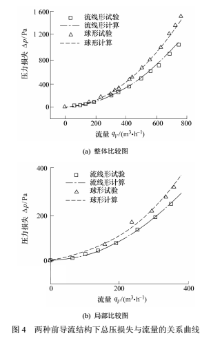 由圖4可知,兩種結構下的計算與試驗值符合很好,誤差在全量程範圍內均小於5%。在小流量(≤200 m³/h)區,無論是計算值還是試驗值,兩種結構的壓損值相差非常小,說明前導流結構在流量較小時對壓損的影響不明顯。隨著流量的增大,結構導致的壓力損失出現了較大差別,明顯看到,流線形與球形的數值差距越來越大,在*大流量處(約 750 m³/h),球形壓損比流線形增大約30%。