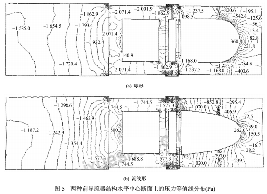 圖5為兩種前導流器結構水平中心斷麵上的壓力等值線分布,宏觀上,圖5a、5b的壓力變化趨勢是一致的:在前導流器、葉輪和支架部分,壓力均不同程度地降低,由支架進入尾流區後,壓力逐步上升。