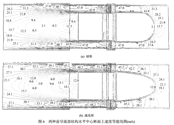 圖6為與圖5相同位置上的速度等值線分布。在前導流器處,可看出對應壓力變化劇烈的區域,速度變化也較大。球形頭部速度急劇增大、直管段速度幾乎不變的分布趨勢使其中心出口速度(47.0m/s)較大(流線形45.2m/s),在同流量下表明球形前導流器具有較大速度梯度。當氣流進入尾流部分後,由於流道突擴,在支架的背麵形成明顯的低速渦區,之後管壁附近速度降低,中心區主流速度回升,速度值被逐漸拉平,對應壓力也逐步回升。可看到,至出口斷麵,流線形的速度不均勻*大差值為6.0m/s,球形為9.4m/s,即球形的出口速度梯度更大,壓力回升則相應較慢。