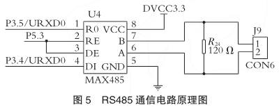 RS485接口組成半雙工網絡,選擇兩線製與上位機電腦相連,采用屏蔽雙絞線傳輸。通信係統整體為總線式結構,這樣1台上位機*多可以和現場32台智能儀表相連。采用MAX485芯片完成電壓轉換,圖5為RS485通信電路原理圖。