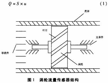 渦輪流量傳感器結構如圖1所示,屬於速度式流量傳感器。渦輪置於流體通道中,隨著流體的流動產生旋轉,設渦輪的轉速為n、流過渦輪的流體速度為u,則n與u成正比;流體通道的流通截麵.積S是已知的常數,所以,流過渦輪流量傳感器的流體體積流量Q為: