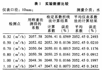 被檢儀表:公稱通徑分別為10mm和15mm的渦輪流量傳感器各一台;檢定裝置:靜態稱重法標準水流量檢定裝置,係統精度+0.2%。分別采用常規的平均儀表係數法和檢定係數折線法進行標.定,並與作為標準的靜態稱重法的檢定結果進行比對,結果見表1.表2。