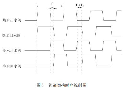開始試驗,冷熱水箱預先達到試驗要求溫度,水泵運轉調節管路流量至設定值。係統給定信號控製四個開關閥(熱水出水閥、熱水回水閥、冷水出水閥、冷水回水閥) 的打開與關閉,實現冷熱水的切換。熱水衝擊時,熱水出水閥與熱水回水閥打開的同時,冷水出水閥與冷水回水閥關閉,確保試驗管路熱水衝擊;同理,冷水衝擊時,冷水出水閥與冷水回水閥打開,熱水出水閥與熱水回水閥關閉,確保試驗管路冷水衝擊。係統通過四個開關閥對管路進行時序控製,達到管路切換的目的,很好地實現了 4000次冷熱循環衝擊試驗。其具體的管路切換控製時序圖如圖 3 所示。