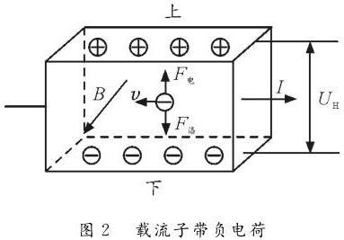 反之,如圖2所示,若載流子帶負電荷,則載流子在洛倫茲力作用下會向下偏轉,導體下表麵積累負電荷。同時,上表麵失去負電荷而帶上正電,從而使上表麵電勢高於下表麵。