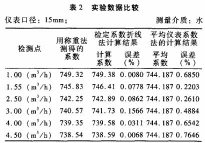 被檢儀表:公稱通徑分別為10mm和15mm的渦輪流量傳感器各一台;檢定裝置:靜態稱重法標準水流量檢定裝置,係統精度+0.2%。分別采用常規的平均儀表係數法和檢定係數折線法進行標.定,並與作為標準的靜態稱重法的檢定結果進行比對,結果見表1.表2。