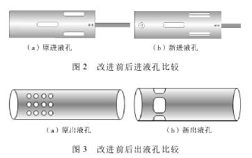 防砂卡重油流量計量表結構如圖1所示,主要由重油流量計量表、篩狀出液孔、重油流量計量表安裝短接、解卡管、解卡管開槽、中心管、長條孔(銷釘運動槽7)、薄壁筒、進液孔、解卡管固定銷釘、含水傳感器安裝筒組成。采用等效麵法,將進液孔一分為二,改為寬2mm的矩形進液孔,解決從進液孔進入的長垢片或大垢片造成的砂卡,如圖2所示。將原先3個方型的出液孔改為直徑4mm的陣列狀的篩孔,解決儀器在下井過程中從出液孔進入儀器的長垢片、大垢片造成的砂卡,如圖3所示。