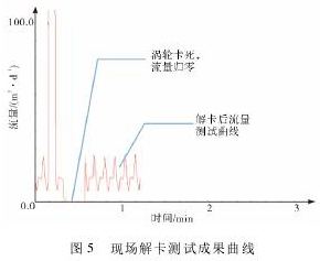 防砂卡重油流量計量表在五大隊成功解卡370井次,現場解卡測試曲線見圖5。剛測試時,渦輪葉片轉動正常,大約在20s左右,由於流體帶進的雜質導致流量曲線歸零。通過儀器二芯供電收傘,大約15s後再開傘,一芯流量供電測試,渦輪葉片通過瞬間開收傘,擴大了葉輪與渦輪殼體之間的空間,雜質通過渦輪葉片旋轉正常。從曲線可以看出,在解卡前和解卡後,渦輪旋轉--致,都為15m3/d左右,而且解卡前後衝次一致,重油流量計量表解卡裝置有效解決了因油井出砂、垢片、間隙小造成的砂卡,砂卡率由原先的70%降低到30%,實現了產液剖麵流量準確測試。