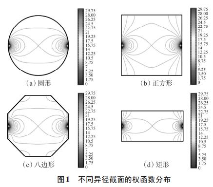 為考察不同異徑截麵權函數分布的均勻性,使用上述方法對圓形、正方形、八邊形和矩形異徑截麵的權函數分布進行定性分析。為了便於對比,設置管道口徑為DN100,異徑部分截麵積為3200mm2。所以,圓形異徑麵半徑為32mm,正方形異徑麵邊長為56.6mm,八邊形異徑麵邊長為25.8mm,矩形異徑麵長寬為80×40mm。仿真結果如圖1所示,為了便於對比,權函數等勢線大小從0開始,以0.25為步長遞增到30。由圖1(a)~圖1(d)可知,矩形異徑截麵的權函數等勢線間距*大,即權函數變化梯度*小,權函數分布*均勻。