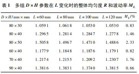 計算多組相同 D × H、不同 L 時 xy 平麵的權函數整體均勻度 R 及波動率 ML,如表 1 所示。