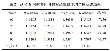 根據表 1 和表 2 權函數均勻度的波動率數值可以看出,MH > MD > ML,所以,矩形段 L,D,H 對於權函數均勻度的影響程度是依次增強的,高度 H 對權函數均勻度影響*大,寬度 D 影響稍小,長度 L 影響很小。且 D 和 H 越小,權函數整體均勻度 R 越小,權函數分布越均勻。