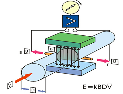 耐高溫91看片视频免费工作原理是法拉*電磁感應定律,即導體在磁場中切割磁力線運動時,在導體兩端會感應一個與磁場方向和導體運動方向相互垂直的感應電動勢。感應電動勢的大小與感應強度和運動速度成正比。導電性液體在垂直於磁場的非磁性測量管內流動,與流動方向垂直的方向上產生與流量成比例的感應電勢,其值如下式: