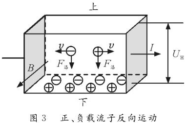 反之,如圖2所示,若載流子帶負電荷,則載流子在洛倫茲力作用下會向下偏轉,導體下表麵積累負電荷。同時,上表麵失去負電荷而帶上正電,從而使上表麵電勢高於下表麵。