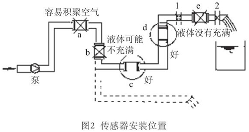 液體流動方向必須與傳感器殼體上箭頭方向一致。對於能正反向測量的冷卻91看片视频免费,若方向不一致雖仍可測量,但設定的顯示流動正反方向不符,必須改正之。若拆傳感器工作量大,也可改變傳感器上箭頭方向和重新設定顯示儀表符號。管道未充滿液體主要是管網工程設計或傳感器安裝位置不妥,使傳感器測量管內不能充滿液體。應采取措施,避免安裝如圖2所示a,e位置和以虛線管排放時b位置,改裝到c,d位置。
