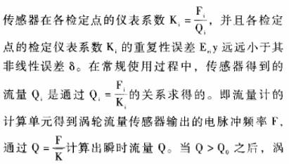 通常情況下,渦輪流量傳感器的量程比a=10、非線性誤差δ≥1.0%而重複性誤差Er≤0.01。如果在使用渦輪流量傳感器進行流量測量時不對儀表係.數取平均值,即不用平均儀表係數`K而是直接使用各流量檢定點的檢定儀表係數Ki,就有可能避免非線性誤差對流量測量的影響。渦輪流量傳感器的測量誤差就有可能從線性度δ=1.0%變為重複性Eri=0.01%。即渦輪流量傳感器的製造工藝不變、遵循現行的計量檢定規程、使用現有的檢定數據,隻是對檢定數據的使用方法稍加改變就有可能成百倍地提高測量準確度。
