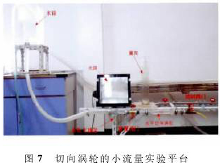 為了驗證仿真的準確性,通過室內實驗對其驗證。切向渦輪采用可視化研究平台,整個渦輪的結構都采用亞克力板雕刻組裝而成。如圖7所示,水箱主要提供穩定水壓,水平切向渦輪做成開口係統並放置在實驗支撐架上,前置閥門可控製水流,在需要更換切向渦輪的零件時可關閉,控製閥門主要是控製流經切向渦輪的流量,流量測量仍采用傳統可靠的容積時間法。實驗時以染色劑作為示蹤劑,以觀察流場的分布情況。