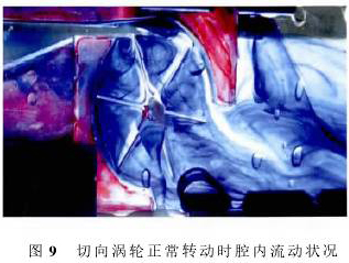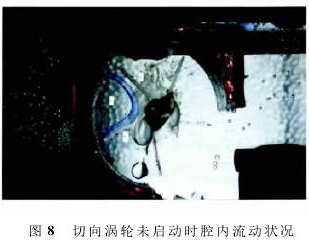 圖9記錄的是切向渦輪正常轉動時的流場,圖9中水從左向右流動,實驗時水速較快(1m3/d),渦輪葉片順時針轉動。水速變大後,擾動變大,不再是無旋繞角流動,腔體1中流體形成一個運動的旋渦,導致腔內壓強分布不再對稱,產生壓差,致使渦輪葉片轉動,旋渦在隨葉片運動到腔體2中時逐漸耗散消失。數值仿真的計算結果與物理實驗的結果基本一致。