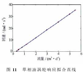 采用同樣的方法,對單相油條件下渦輪響應規律進行研究(見圖11),測得單相油的啟動排量為0.08m3/d。對單相油的實驗結果進行擬合,可得單相油的響應曲線為ω=6.73Q-6.72。與水對比而言,油的擬合曲線斜率更大,即隨著流量增加轉速增加得略快。
