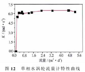 可以看出,渦輪啟動後*先進入一個非線性段,在非線性相應段,K值隨著流量增加而增大;當流量比較大(單相水超過0.5m3/d,單相油超過1m3/d)時,渦輪進入線性段,在線性響應段,K值達到峰值,有相對較小的波動。