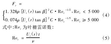 式中:Cl和Cd為葉柵的升力係數和阻力係數,二者可通過不可壓縮勢流的方法計算,與葉片翼型、葉輪轉速、來流速度和半徑位置等參數相關。