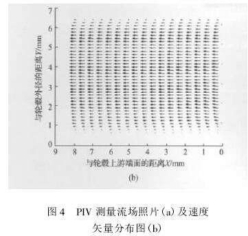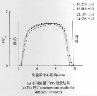 通過對PIV實驗中所拍攝的照片(見圖4(a))進行後處理,可以得到各個流量點下輪轂與管壁之間軸截麵流場軸向速度分布信息如圖4(b)所示。鑒於試驗模型的軸對稱性,從原理上說該軸截麵的速度分布可以推廣到周向環形區域。