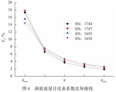 4支流量計各流量點q下儀表係數誤差ET曲線如圖4所示。