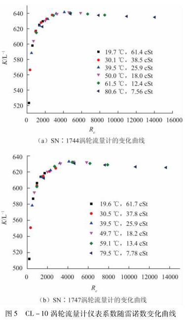 熱水計量表不同溫度點儀表係數差異很大,主要原因是溫度改變導致航空潤滑油粘度改變。校準結果中儀表係數隨流量變化曲線未體現滑油粘度對熱水計量表的影響,流量計儀表係數K隨雷諾數的變化曲線如圖5和圖6所示。同一支流量計在雷諾數相近的情況下,其對應的儀表係數很接近,儀表係數是雷諾數的單值函數。雷諾數Re關係式為