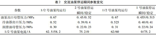 通過內部旁通將冷油與熱油混合,經過銅粉- 煤油 - 蠟感溫元件控製冷熱油混合比例,將油溫調節到 49 ℃。一台防爆渦輪流量計穩定運行,油泵出口母管壓力 0. 5 MPa,潤滑油母管壓力 0. 24 MPa,均屬於正常情況,而兩台交流油泵並列運行時,停運其中一台交流油泵瞬間會觸發防爆渦輪流量計出口母管壓力開關動作,說明停運瞬間油壓發生波動,且油泵出口母管油壓波動至小於 0. 45 MPa。正常運行時防爆渦輪流量計出口油溫 71.5 ℃,冷油器出口溫度45 ℃,混合後潤滑油母管溫度52.5 ℃,由能量守恒定律可知,經過冷油器的油量/不經冷油器的油量= ( 71.5-52.5) ÷ ( 52.5- 45) = 2. 53,說明有 70% 左右的油量經過冷油器。當 2 台防爆渦輪流量計運行時油量大於單泵運行,其中一台防爆渦輪流量計瞬間停運時油量減少,尤其是經過冷油器的油量大量減少,油量在溫控閥二次分配過程中出現調節異常,導致油壓過大波動。為檢驗溫控閥工作情況,保持 1 號、2 號交流油泵運行,選取機組正常帶負荷運行時油溫 52 ℃,分別停運 1、2 號交流油泵,觀察 1、2 號交流油泵停運瞬間油泵出口母管壓力波動情況,試驗各參數變化見表 2。