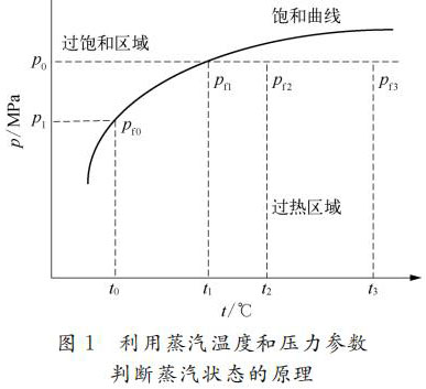 利用蒸汽的溫度壓力參數自動判斷蒸汽處於過熱狀態還是飽和狀態,原理如圖1所示。關鍵是判斷蒸汽的溫度壓力值是落在臨界飽和曲線的下方還是上方,如果落在下方,則為過熱狀態;如果落在上方,則為飽和狀態。