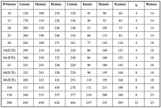 *DN10/DN50(輕型)/DN65/DN80(輕型)法蘭尺寸為 1.6MPa 標準;其餘口徑為 6.4MPa 標準;