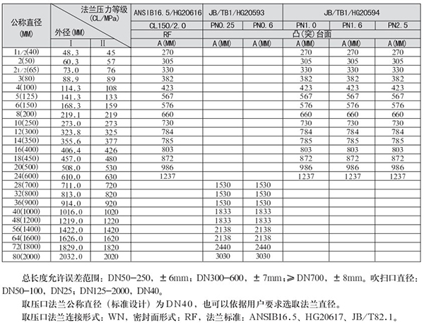 1.總長度允許誤差範圍:DN50-250,±6mm;DN300-600,±7mm;≥DN700,±8mm。吹掃口直徑:DN50-100,DN25;DN125-3000,DN40。