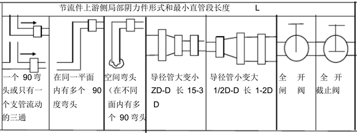 節流裝置的安裝和適用於下列管段和管件有關:節流件上遊側*一阻力件、*二阻力件,節流件下右側*一阻力件,從節流件上遊*二阻力件到下遊*一阻力件之間的管段以及差壓訊號管路等。