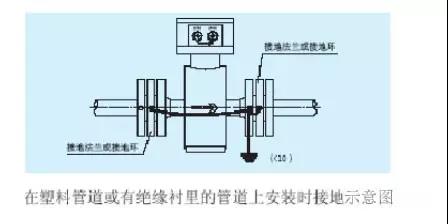 傳感器在塑料管道上或在有絕緣襯裏的管道上安裝,傳感器的兩端應安裝接地環、或接地法蘭、或帶有接地電*的短管,按下圖接地。
