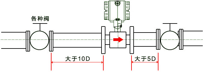 1、對直管段的要求:渦輪流量計必須水平安裝在管道上(管道傾斜在5以內),安裝時流量計軸線應與管道軸線同心,流向要一致。渦輪流量計上遊管道長度應有不小於2D的等徑直管段,如果安裝場所充許建議上遊直管段為20D、下遊為5D。