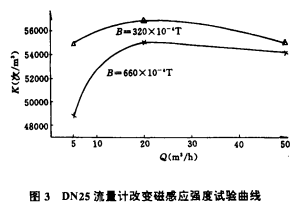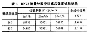 位於流量計之上,緊貼殼體處安裝著磁電轉換器,它將對渦輪葉片(由鐵磁性材料製成)產生一個恒定的磁性阻力矩。無論葉片處在靜止或轉動過程中都將始終受到這一磁力作用。這一磁力將直接影響著流量計的性能,尤其小流量時影響更大。為了研究該磁力對流量計性能的影響情況,91看片下载免费观看選取適當的磁感應強度,對同一台DN25流量計進行了變磁感應強度B的影響試驗,其試驗結果見表3和圖3。