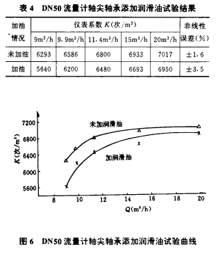 通過試驗表明,潤滑油對流量計小流量的性能的影響較大,隨著流量的增大,兩條曲線之間的差值逐漸減小。由於軸尖和軸承的摩擦阻力很小,並且采用硬質合金材料製成,耐磨性很強,故建議流量計在出廠標定前可以不必加入潤滑油。