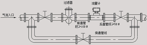 4、為了檢修時不至影響液體的正常輸送,應在傳感器兩端的直管段外安裝旁通管道(如圖四);