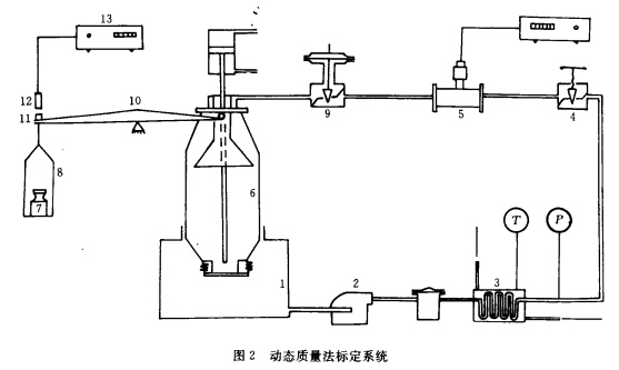 由於靜態法必須等待容器中的液體靜止後才能測量,另外容器中不能存在殘留液體,所以效率低,動態標定法是在液體流動情況下進行質量或容積測量:一般先把容積或質量固定,隻測量時間,操作簡便,效率高。圖2為1種動態質量法標定係統,可在連續運行狀態下對流量計進行標定。其工作過程為:打開主泵2.使油液在回路中循環;調節油溫控製器3.使油液達到標定溫度;調節流量調節閥4.使被校流量計5.指示標定刻度;流場穩定後先在祛碼盤8中加起始質量祛碼,秤10失去平衡;按標定按鈕,計量油箱6底部放泄閥關閉、計時、計數器13回零,開始充液;隨著計量油箱中油液增加達到起始質量時,秤10恢複平衡,執行元件11觸發傳感器12.使計時、計數器13開始計時計數;再將一標準質量砝碼加於砝碼盤8中,秤10又失去平衡;繼續充液,當*二次達到平衡時,再次觸發傳感器12.使計時、計數器停止工作。由所計時間t和質量即可求出質量流量。一個循環結束後,放泄閥自動打開,計量油箱中的油液放到主油箱1中.整個標定過程中,隻需人工調節流量閥,加2次固定質量的標準祛碼。每次循環時間1~2min,效率較高。另外計量油箱全部質量支在秤上,不與管路係統有剛性連接,因此精度高。為了防止油液衝擊影響測量精度,計量油箱中采取了防衝擊措施。