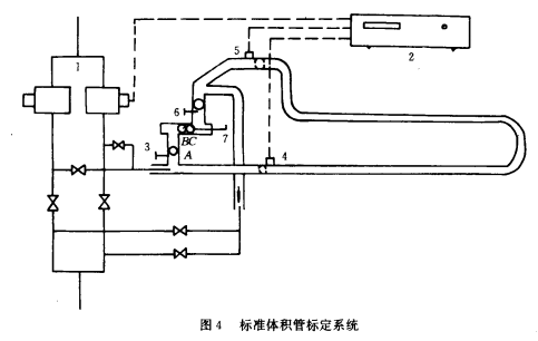 由於標定係統難免有殘存液體,尤其是粘性較大時附著在壁麵上的液體,須另加衝洗係統和加熱係統,使設備複雜化。另外,容積法受容積誤差影響,質量法受管路係統支撐係統影響,測量精度受到限製,近代出現的標準體積管具有精度高、係統簡單、占地麵積小、便於在線標定、容易配合計算機進行實時標定,尤其適於粘性液體,被公認為*佳的粘性液體流量標定裝置。其基本原理是檢測通過一定容積液體所需時間,標準體積管的容積誤差為±0.35%。圖4為標準體積管標定係統原理圖,工作順序為:拔出銷3,球A落入管道,再插進銷3,球A被流動的液體推動到檢測器4時,檢測器給計時器發信號,開始計時,球A到達檢測器5時,給計時器發出停止計時信號,計量結束。2檢測器之間的體積一定,按所計時間求出容積流量。球A繼續前進,停在銷6處。推球器7退出,拔出銷,6,球A生落下,同B、C球並列,推進推球器7,使B球落下,用C、A2球密封,B球落在銷3上,同時插進銷6,等待下一次標定。