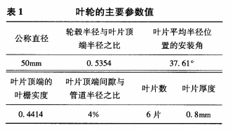 為了提高數值模擬精度,盡可能保留了渦輪流量計的結構特征,例如導流件輪轂與葉輪輪轂之間的間隙。流量計外殼內徑為50mm,葉輪的主要參數如表1所示,流量計的設計流量為4~40m3/h。前導流件前端和後導流件的後端采用球形結構,前、後導流件葉片與葉輪葉片的間隙分別為12mm和7mm,導流件葉片厚度為1mm。導流件輪轂和葉輪輪轂同徑,輪轂之間的間隙為2mm。